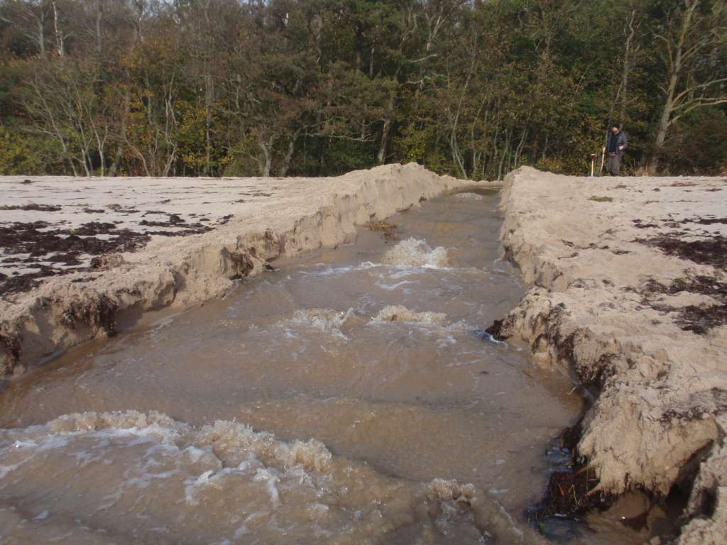 Flödet kommer i gång och vattnet gräver sig ned i sandvallen.
